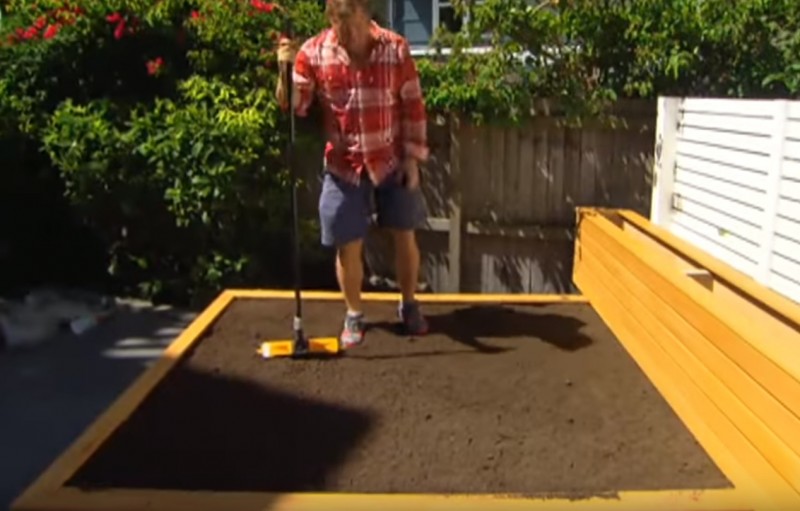 2. Danach befüllt er das Gestell mit Mutterboden .