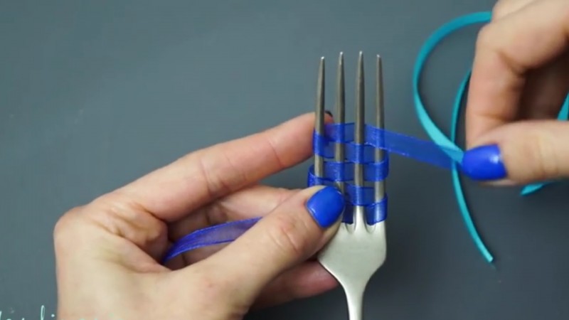 1. Du fängst an in dem du das Stoffband immme Abwechselnd (vorne / hinten ) durch die Gabelzinken ziehst